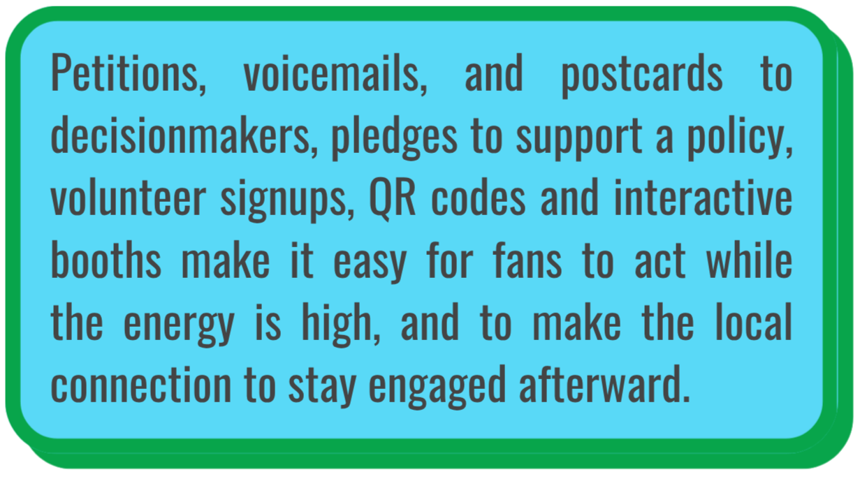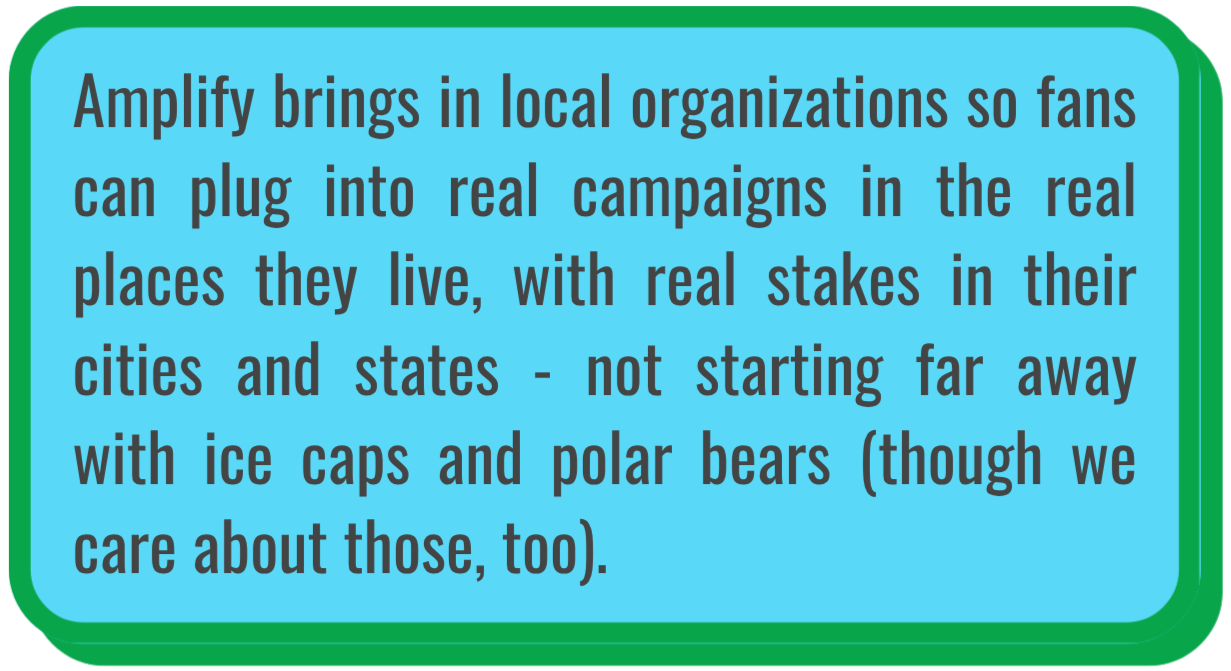 Amplify taps into collective effervescence to inspire fans to connect to actions in the moment, and local organizers use those interactions to build ongoing larger networks for change.