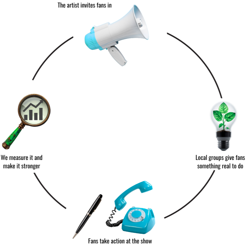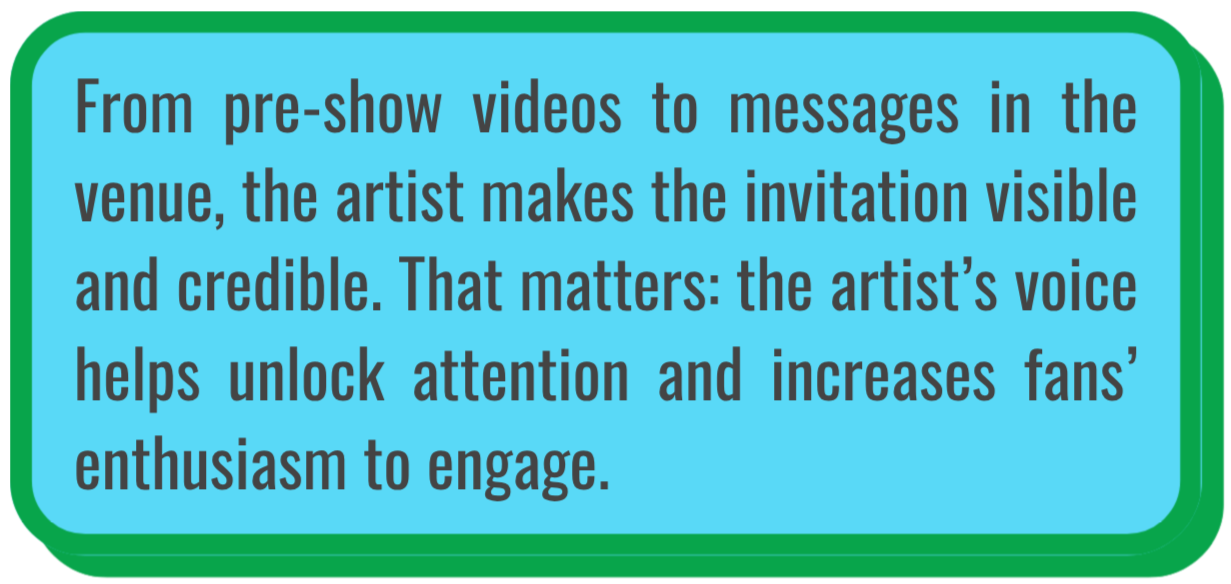 Artists can help build that civic power when their fans are already gathered, emotionally engaged, and paying attention. That special live energy - like at concerts and sports events - that makes people feel more connected and empowered is an experience sociologists call “collective effervescence.”